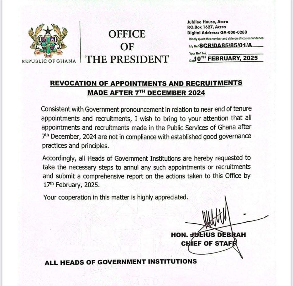Reports from multiple news sources confirm that Chief of Staff Julius Debrah has annulled all public service appointments and recruitments made after December 7, 2024.
