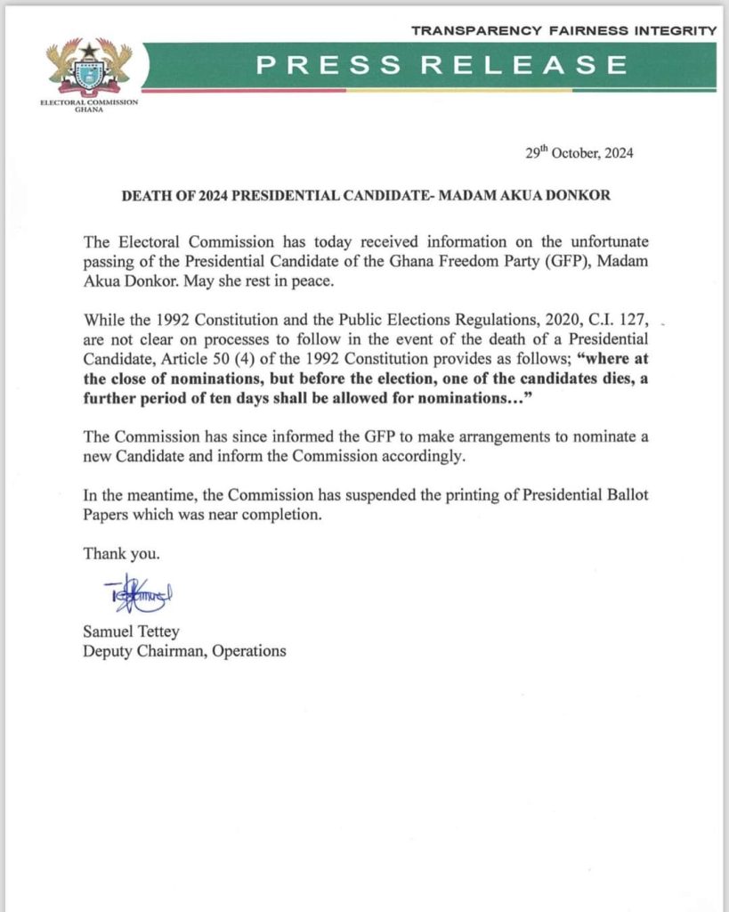 The Electoral Commission of Ghana has announced a halt in printing ballot papers for the upcoming December 7th election through an official statement, following the death of the Ghana Freedom Party’s presidential candidate, Madam Akua Donkor.