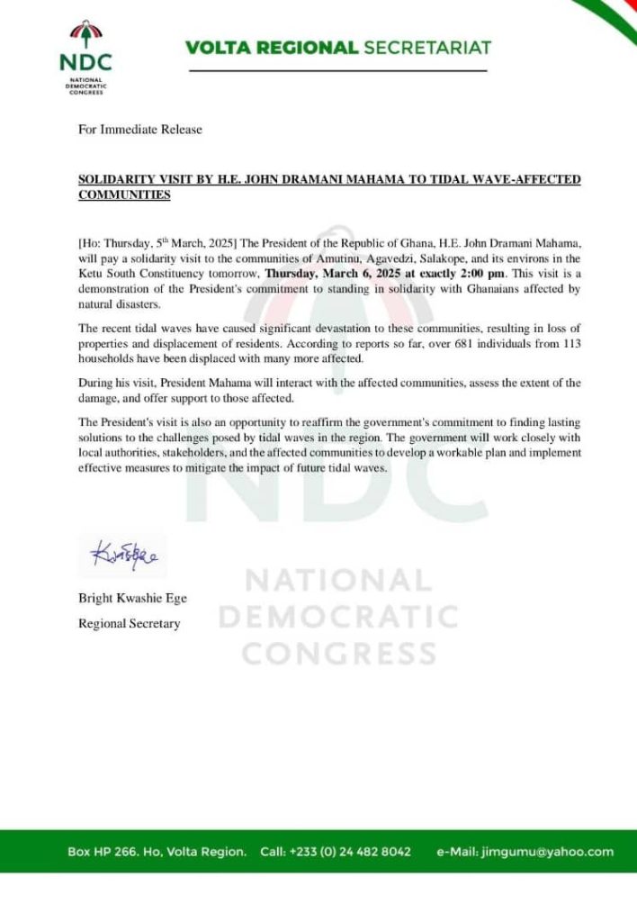 President John Dramani Mahama is set to visit Agavedzi and its environs today, March 6, 2025, to assess the extensive damage caused by recent tidal waves and to express solidarity with the affected residents. His visit underscores a sustained commitment to addressing the persistent challenges coastal communities face in the Volta Region.