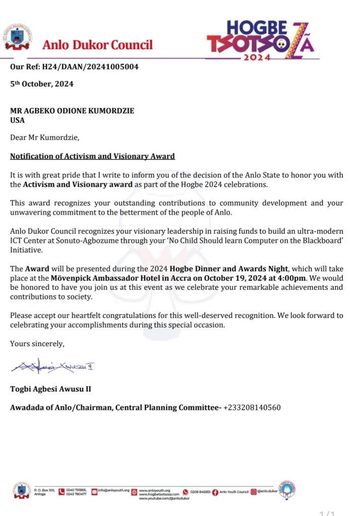 In recognition of his continued achievements, Mr. Agbeko Odione Kumordzie received an Honorary Award for Activism and Visionary Leadership from the Awadada of the Anlo State, Togbi Agbesi Awusu II, on October 5, 2024, honoring his unwavering contributions and support to the people of Anlo.
